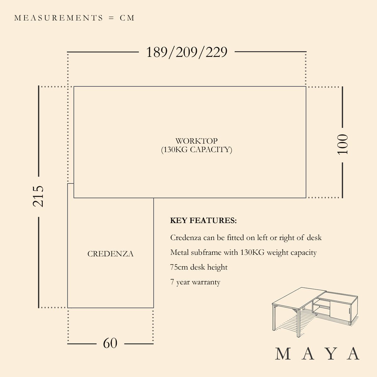 Designed for both left and right-hand configurations, the Maya Corner Computer Desk can be tailored to complement any workspace layout. Available in 189cm, 209cm or 229cm widths, with an overall depth of 215cm and a 100cm deep worktop, Maya offers an expansive surface area for even the most demanding computer setups.
