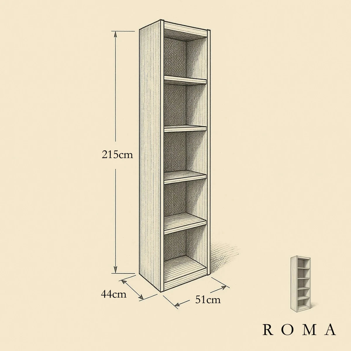 The Roma Single Shelving Unit is a refined tall-format storage piece designed for both home and professional interiors. Standing at 2150mm high and 510mm wide, it offers five evenly spaced shelves, each crafted from solid 38mm panels for a clean, architectural look. With a choice of MFC or lacquered finishes, the unit blends seamlessly into contemporary workspaces, studios and living areas.