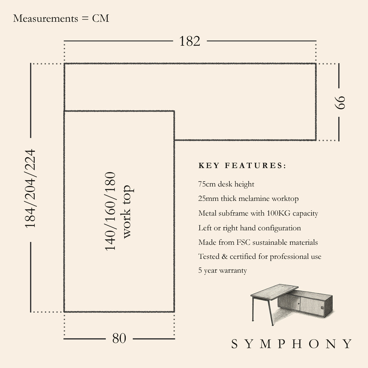 Built around a reinforced metal sub-frame, the Symphony offers exceptional stability with a 100 kg weight capacity, making it ideal for demanding setups and full-sized PC configurations. The integrated storage credenza keeps your workspace organised with generous capacity for files, devices, and accessories - all hidden behind sleek sliding doors to maintain a clean, modern aesthetic.