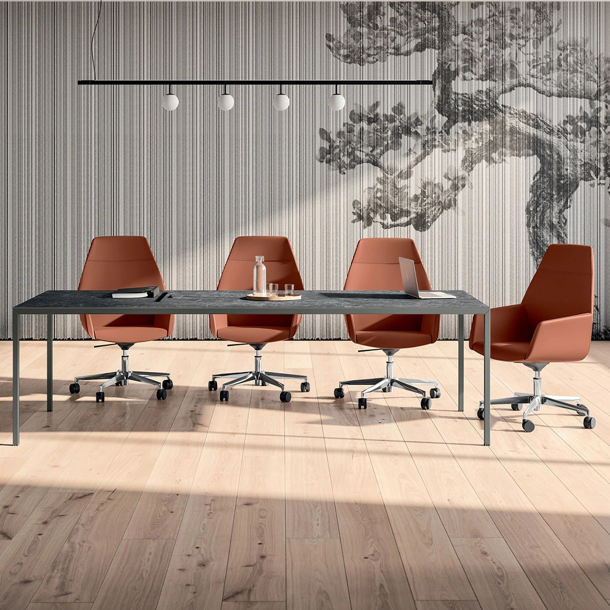Unlike a traditional wheeled office chair, Vela features a fixed feet base that provides stability on hard floors and soft surfaces alike. The smooth swivel mechanism allows natural movement while maintaining a grounded and composed feel — ideal for meeting rooms, executive settings, and considered home offices.